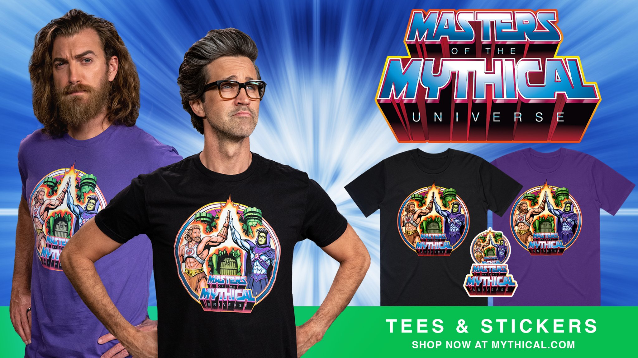 We merged comedic best friends Rhett & Link with arch-enemies He-Man and Skeletor to create the Mythical Masters of the Universe tee and sticker set, which was promoted heavily on Good Mythical Morning and cross-promoted by Mattel.