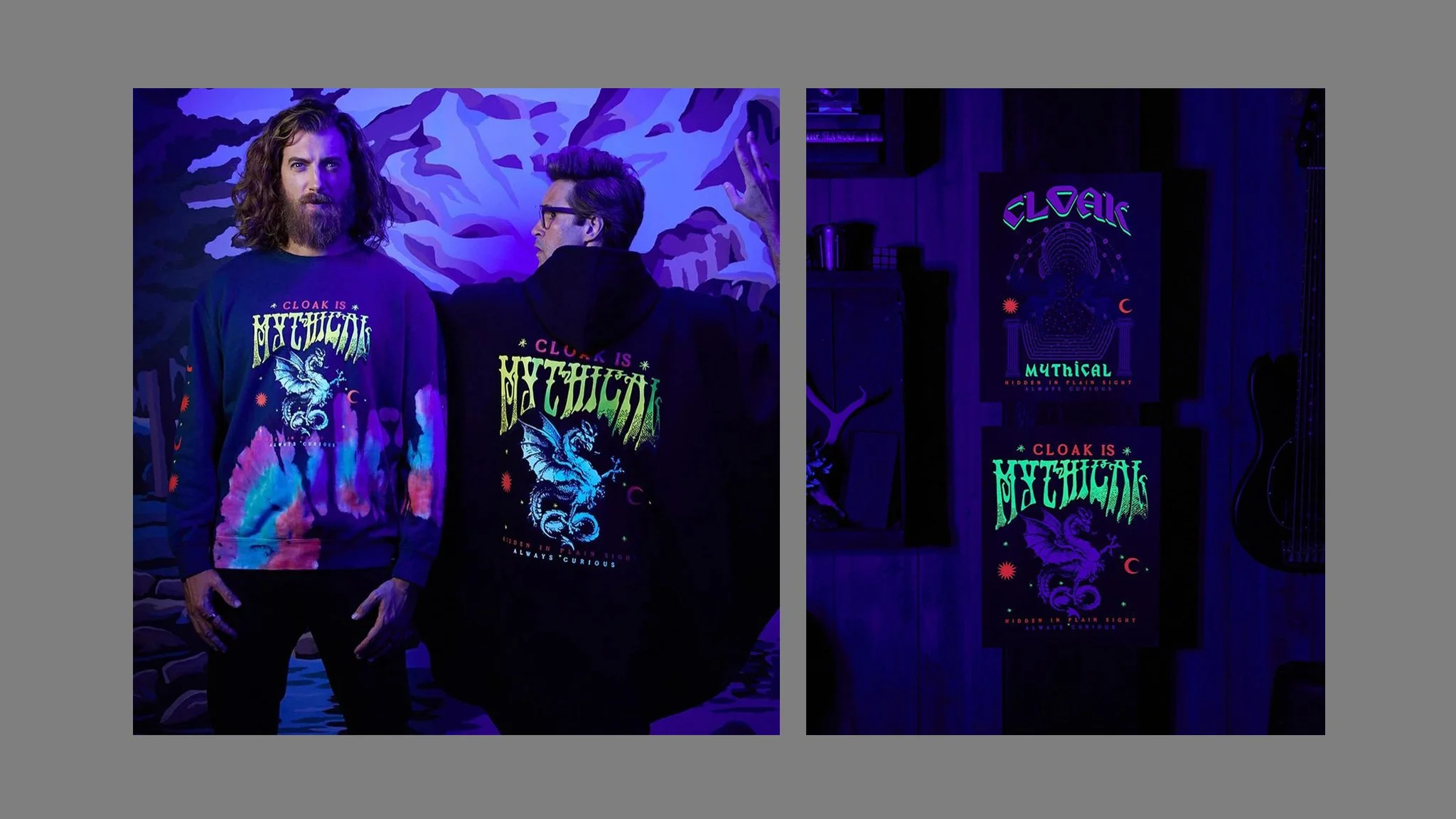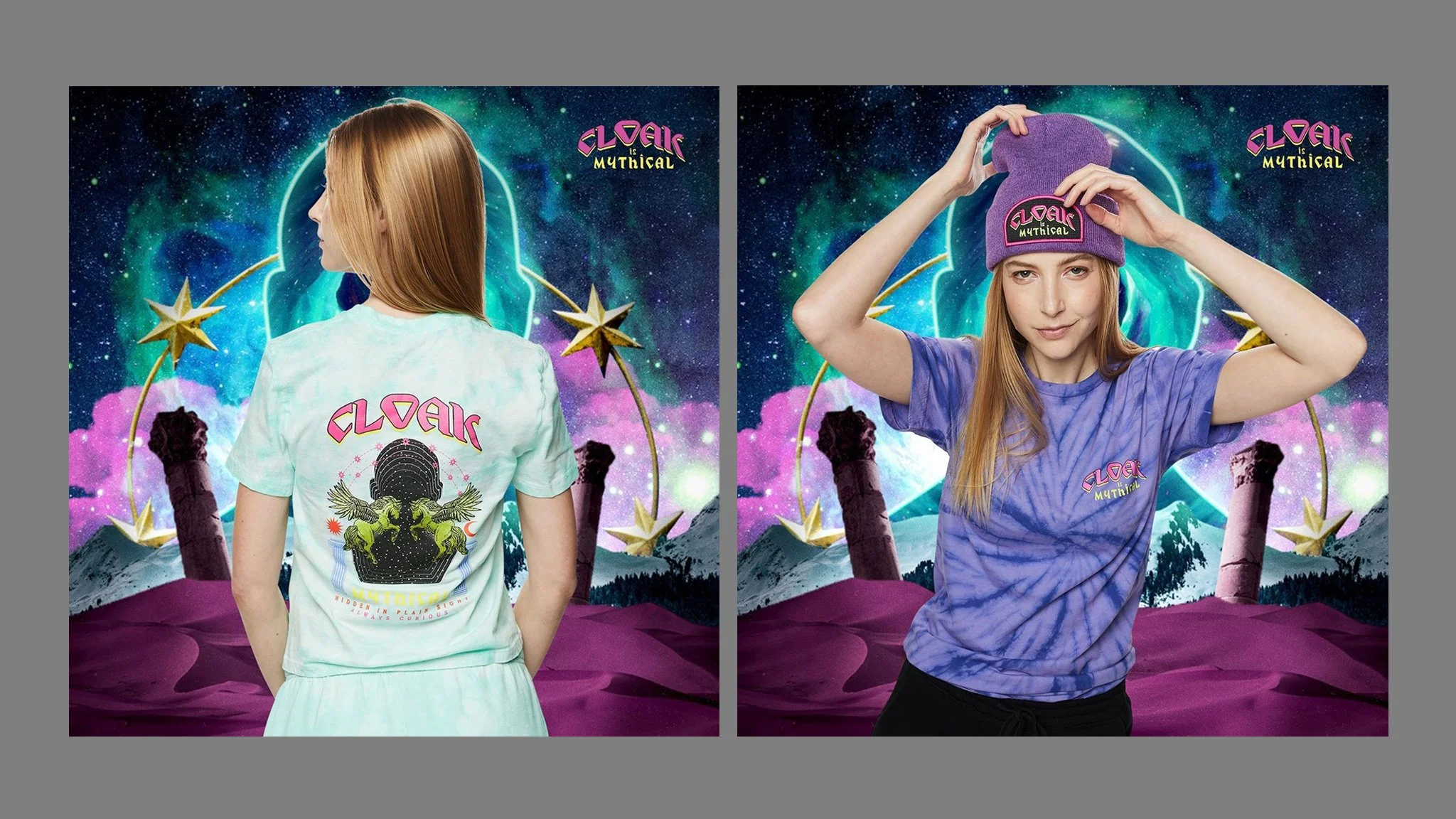 Our two teams collaborated on blending the worlds of gaming and mythology into a psychedelic tapestry of branded visuals for a limited edition apparel and accessories collection, which was cross-promoted on Cloak and Mythical channels.